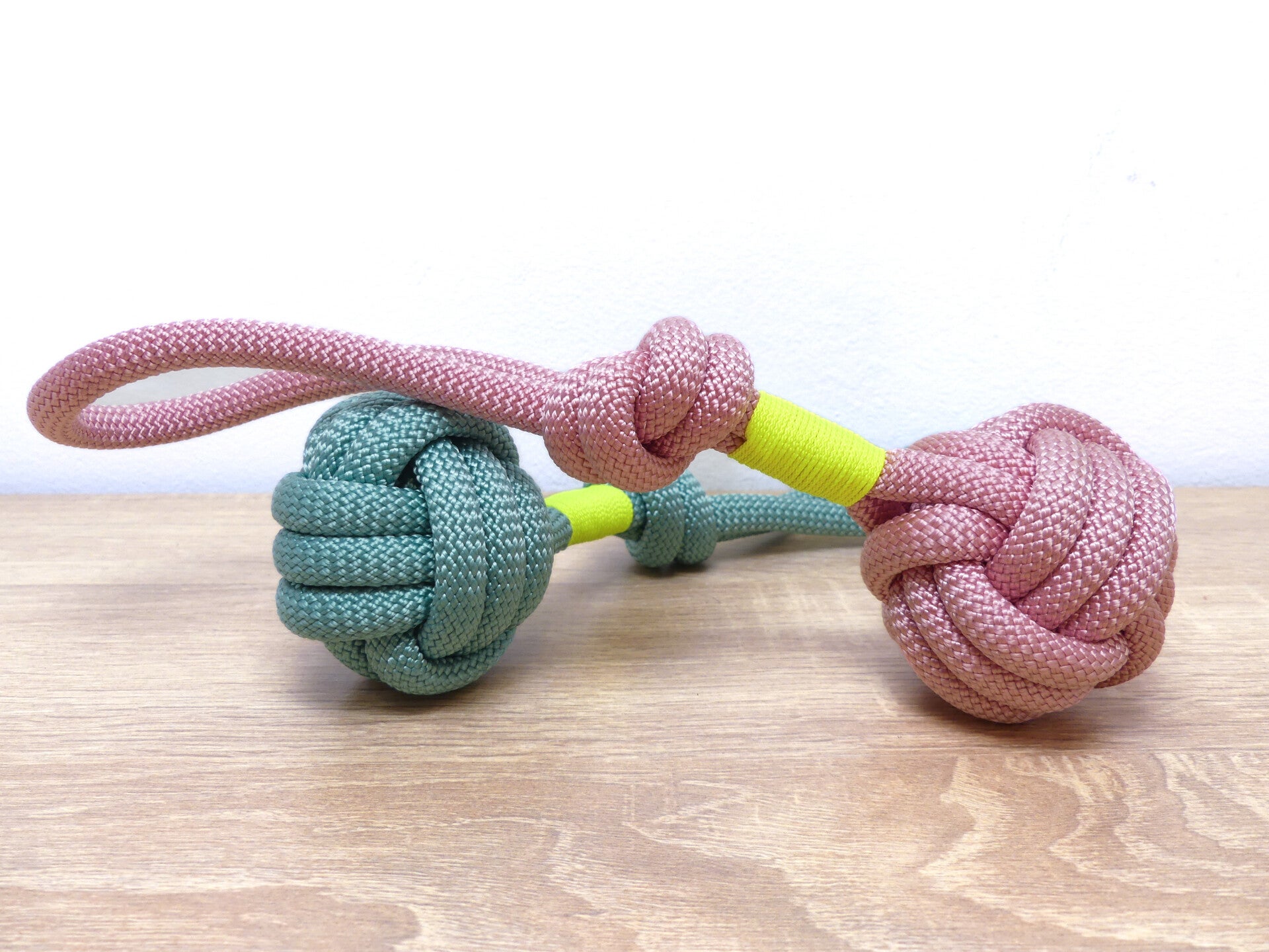 Das Hundespielzeug wird aus einem Premiumseil aus Polypropylen hergestellt und mit einer neonfarbenen Takelung verziert. Das Seil besitzt ein OEKO TEX Zertifikat und wurde damit für Mensch und Tier als ungiftig und sicher eingestuft, was natürlich oberste Priorität bei einem Hundespielzeug hat. Das Tau hat ein geringes Gewicht und ist gleichzeitig extrem reißfest. Zudem besitzt es eine hohe Wetterfestigkeit und Schwimmfähigkeit. Damit ist es auch das ideales Spielzeug für alle Wasserfans unter den Fellnasen.