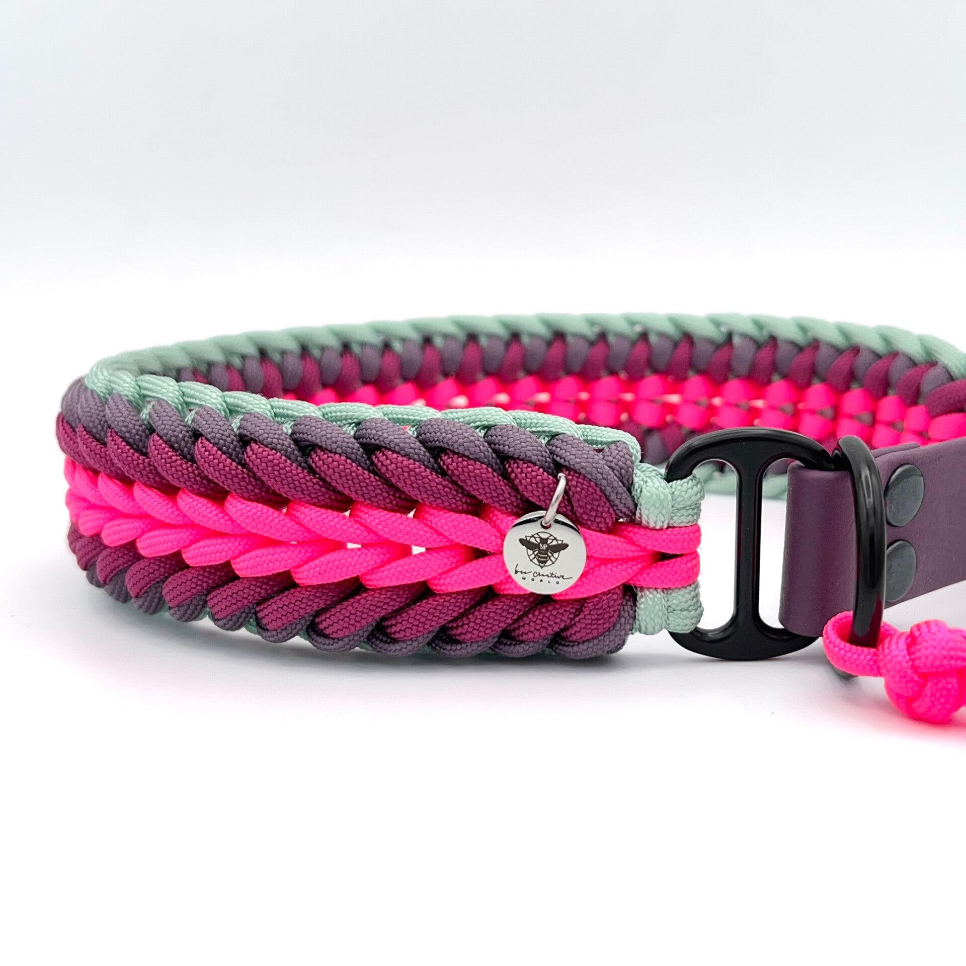 Hier kommt dein neues verstellbares Hundehalsband - POLARIS! Handgefertigt aus hochwertigem Paracord 550 in Neon Pink, Violett und Mint - ein auffälliges und stylisches Halsband für deinen Vierbeiner.