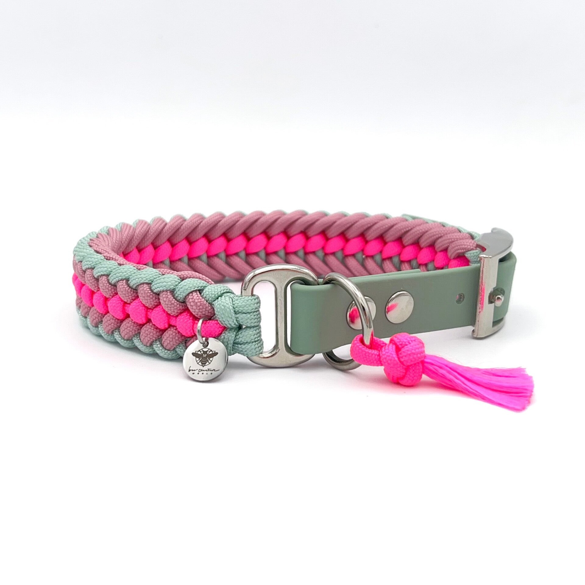Die Leine lässt sich am D-Ring befestigen. Dieser ist mit einer kleinen Paracord-Quaste verziert ist. Hier lässt sich ebenfalls eine Hundemarke, Tasso-Marke o. Ä. anbringen. Da wird großen Wert auf Details legen, erhält jedes Hundehalsband einen eleganten BeeCreativeWorld-Anhänger als abschließendes Highlight.