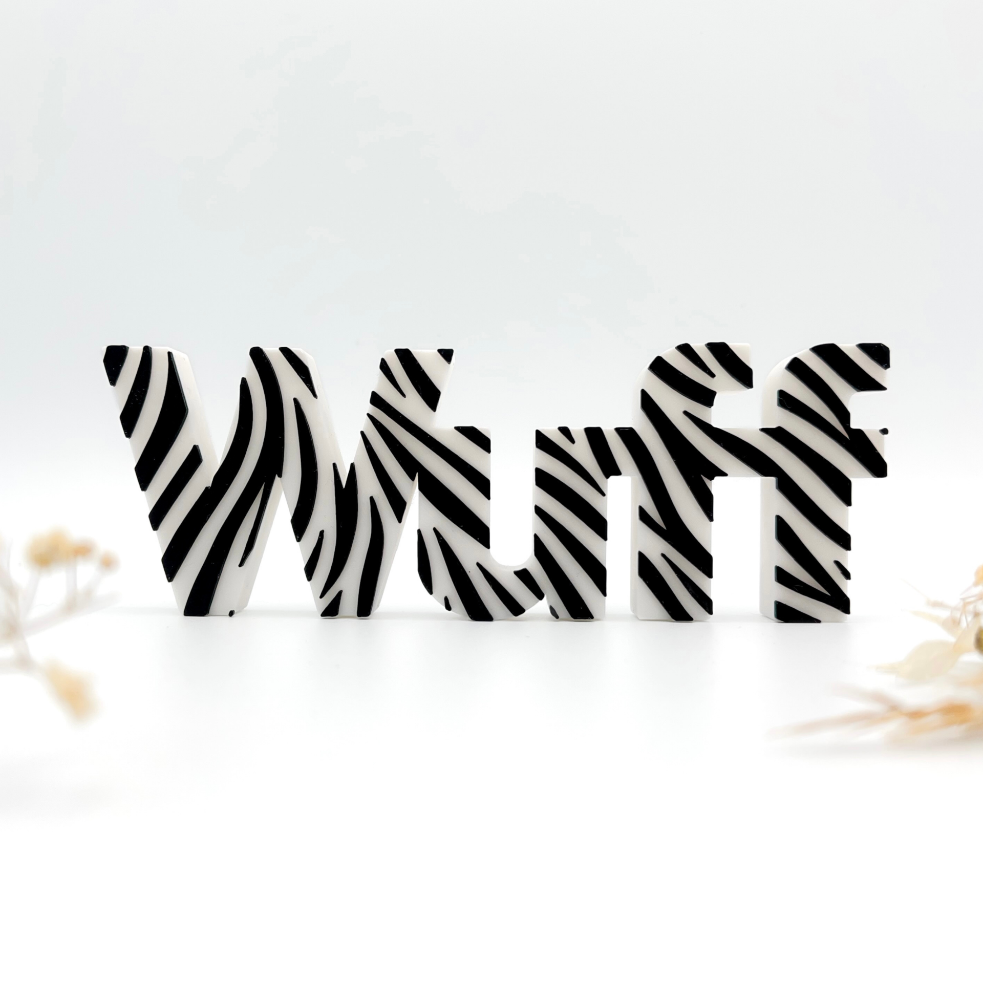 Der Deko-Aufsteller „Wuff“ in moderner Zebraoptik ist ein echtes Statement-Piece für alle Fellnasen-Liebhaber. Mit seinem schicken Schriftzug und der auffälligen Oberfläche eignet er sich perfekt, um deiner Wohnung das gewisse Etwas zu verleihen oder jemandem eine besondere Freude zu machen. Stelle einfach deine Lieblings-Farbkombination zusammen und setze ein stylisches Statement.